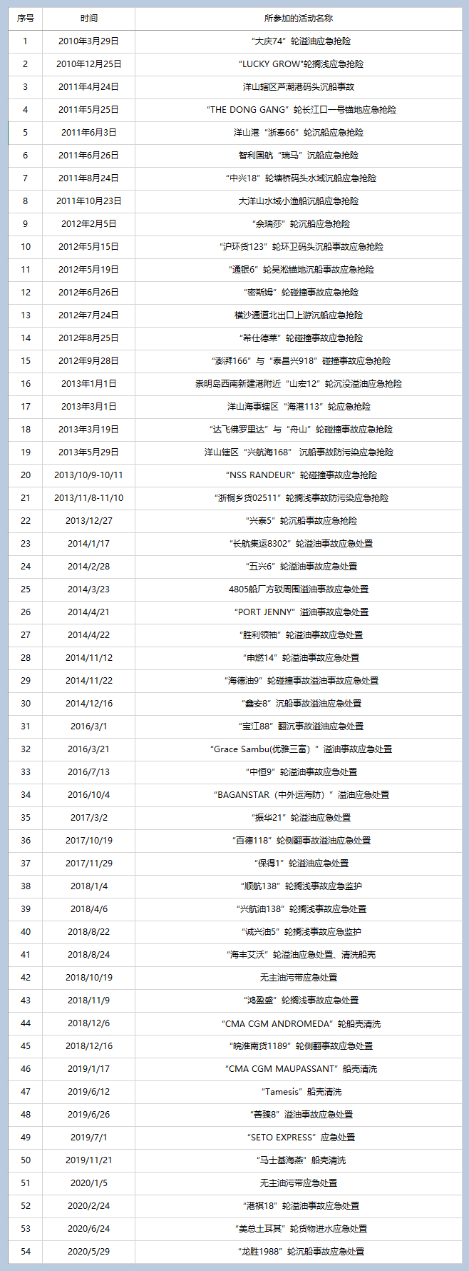 公司现有4艘处置船和9艘辅助船,现有高级指挥人员3人,现场指挥8人,实施清污作业的应急操作人员40名。根据上海港实际情况和上海海事局的相关要求,公司在洋山港与杭州湾海区水域、长江水域(宝山辖区和崇明辖区)和黄浦江水域设立四个应急监护待命点,并设立了宝山总仓库和三个应急器材分库,库内各类应急器材设备按一级资质要求采购、布置,应急清污能力可覆盖上海港及其沿海水域。